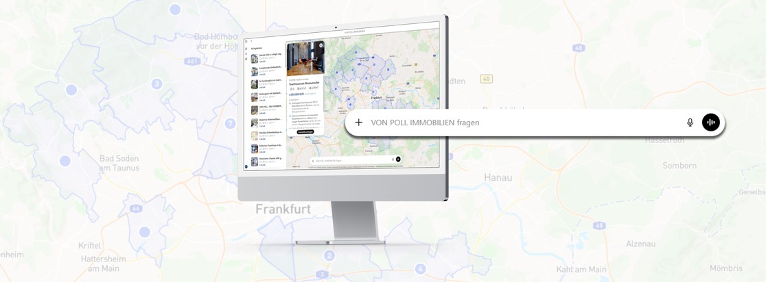 - Immobiliensuche direkt im Dialog: Nutzer beschreiben ihre Wünsche in ihrer natürlichen Sprache – Stadt, Budget, Zimmeranzahl, Wohnfläche – und erhalten passende Angebote aus dem VON POLL IMMOBILIEN Portfolio
