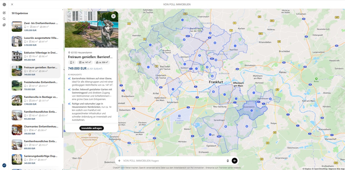 Mit der neuen VON POLL IMMOBILIEN ChatGPT App können Nutzer Immobilien direkt innerhalb von ChatGPT suchen. Statt starre Suchmasken mit Dutzenden Feldern zu nutzen, formulieren sie ihre Wünsche einfach in ihrer natürlichen Sprache – beispielsweise eine Altbauwohnung mit Balkon in München bis zu 500.000 Euro oder ein Haus mit Garten in Hamburg zum Kauf. Die KI übersetzt diese Angaben in passende Immobilienangebote aus dem VON POLL IMMOBILIEN Portfolio und stellt diese übersichtlich mit Fotos, Eckdaten und einer kurzen Zusammenfassung der wichtigsten Merkmale dar. Über einen direkten Link gelangen Interessenten anschließend zum vollständigen Exposé auf der Website des Maklerhauses und damit zum zuständigen Immobilienexperten vor Ort.