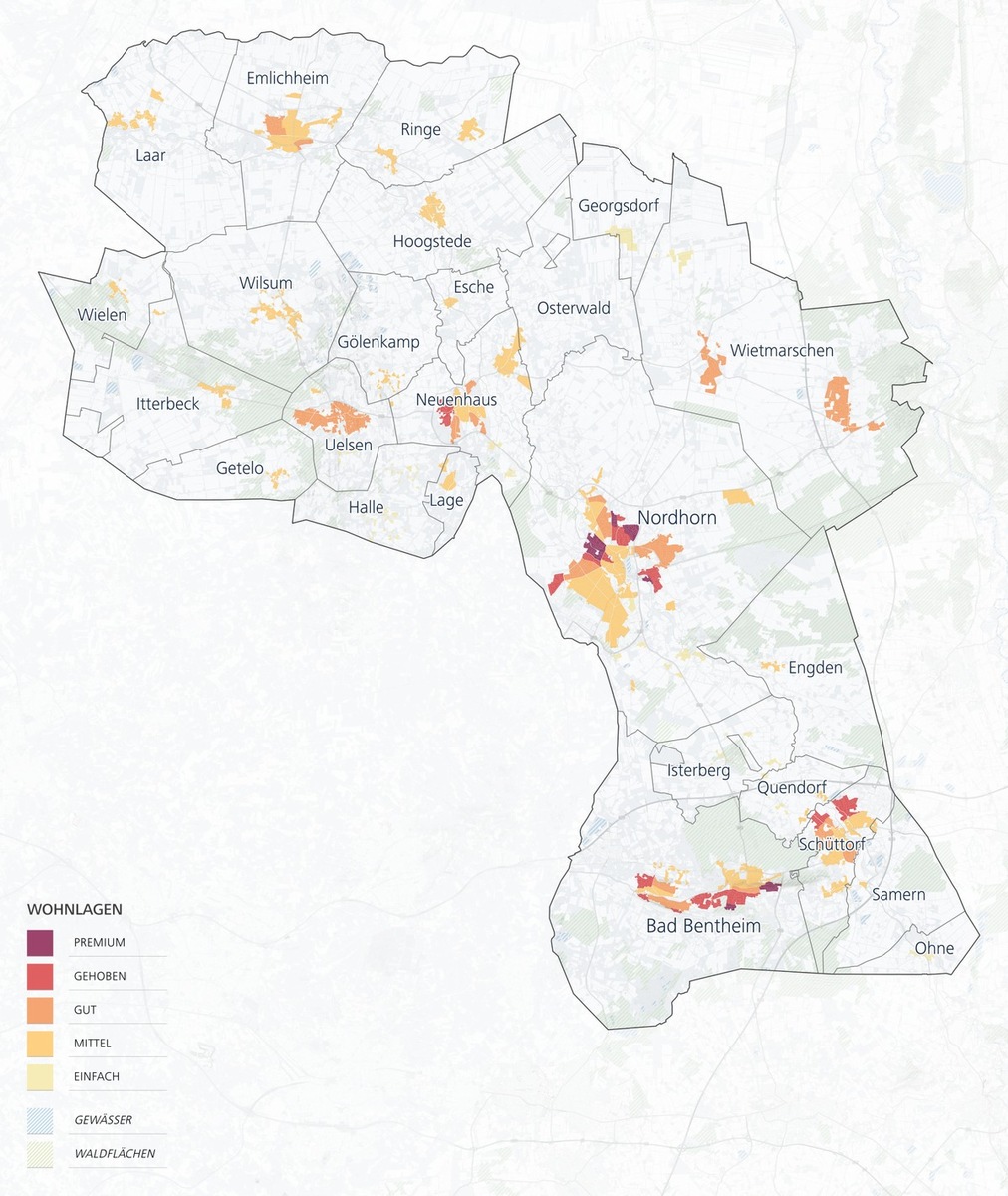 Zu den Trendlagen der Grafschaft zählt Emlichheim, das unter anderem von seiner unmittelbaren Nähe zur niederländischen Grenze sowie einer stabilen wirtschaftlichen Struktur profitiert. Die Gemeinde Uelsen wiederum bietet eine äußerst naturnahe Ausrichtung, was diese Trendlage besonders bei Familien sehr begehrt macht.