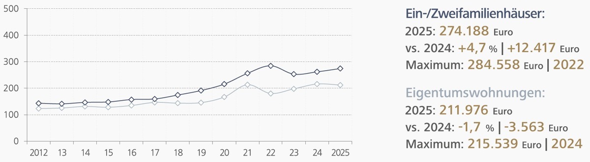 - Der Durchschnittspreis für ein Haus stieg 2025 mit 4,7 Prozent auf circa 274.188 Euro leicht an, während der durchschnittliche Preis für eine Wohnung mit -1,7 Prozent geringfügig sank auf rund 211.976 Euro