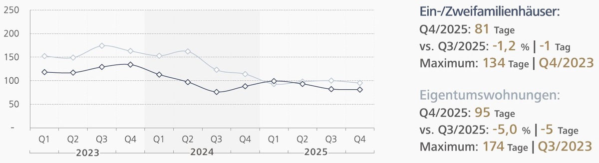 - Die Angebotsdauer hat sich ebenfalls weiter leicht verkürzt und betrug im ersten Quartal 2025 bei Häusern 81 Tage, bei Wohnungen 95 Tage