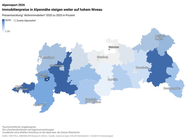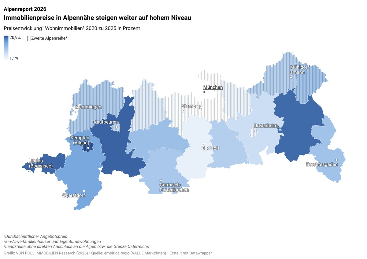 2 Analysiert wurden die neun südlichsten, an Österreich angrenzenden, bayerischen Landkreise mit direktem Alpenanschluss, also in erster Alpenreihe gelegen, nach Definition und Einteilung von VON POLL IMMOBILIEN Research (2026): Miesbach, Garmisch-Partenkirchen, Bad Tölz-Wolfratshausen, Rosenheim, Lindau (Bodensee), Traunstein, Berchtesgadener Land, Oberallgäu und Ostallgäu.