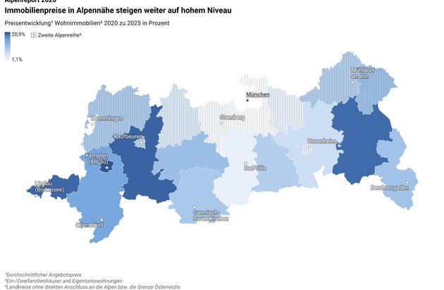 - Insgesamt sind die Immobilienpreise 2025 in den Landkreisen in erster Alpenreihe im Fünf-Jahresverlauf um 11,7 Prozent gestiegen, die Landkreise in zweiter Alpenreihe verzeichneten im selben Zeitraum einen Zuwachs von lediglich 5 Prozent