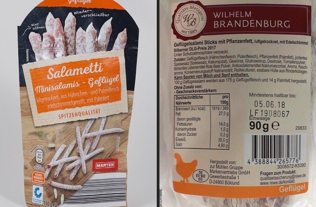 Warenrückruf für "Wilhelm Brandenburg - Geflügelsalami Sticks mit Pflanzenfett, luftgetrocknet, mit Edelschimmel, 90g", sowie "Marten Salametti Minisalamis-Geflügel, 100g"