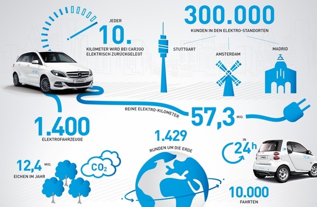 "Die Zukunft des Carsharings ist elektrisch, das ist unsere Überzeugung", sagt Olivier Reppert, CEO von car2go. An drei rein elektrisch betriebenen Standorten hat car2go mittlerweile 300.000 Kunden, die regelmäßig mit den 1.400 Elektrofahrzeugen des Marktführers im flexiblen Carsharing unterwegs sind. Täglich werden dabei 10.000 Fahrten unternommen. Insgesamt haben car2go Kunden bereits 57,3 Millionen reine Elektro-Kilometer zurückgelegt. Das entspricht 1.429 Runden um die Erde oder so vielen Tonnen CO2 wie 12,4 Millionen Eichen oder ein 24.000 Hektar großer Fichtenwald jährlich binden könnten.