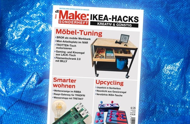 Das Sonderheft präsentiert neben dem Werkstattwagen weitere kreative Umbauten: Aus einer einfachen Kunststoffbox wird ein USB-Gamecontroller, das Ivar-Regal verwandelt sich in eine platzsparende Arbeitsecke. Selbst die ikonische blaue Ikea-Tragetasche lässt sich mit simplen Tricks noch verstärken und mit einem Regenschutz ausstatten.
