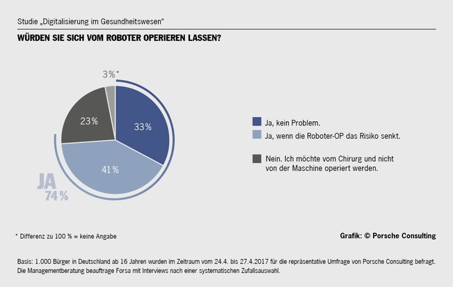 Eine Studie von Porsche Consulting ergab, dass viele Menschen in Deutschland einer Behandlung oder Betreuung durch Roboter aufgeschlossen gegenüberstehen: Drei von vier Bürgern in Deutschland haben nichts dagegen, wenn bei einer Operation im Krankenhaus "Kollege Roboter" statt eines Chirurgen das Skalpell führen würde. Unter den Befragten knüpfen 41 Prozent ihr "Ja" an die Bedingung, dass der Robotereinsatz weniger risikoreich wäre als die Behandlung durch einen Arzt. Ähnlich positiv äußerten sich die Befragten, wenn es um die Betreuung im Alter geht: Aus dem Bett heben, Medikamente geben, Speisen und Getränke reichen - typische Tätigkeiten von Pflegekräften könnten schon bald auch von computergesteuerten Robotern erledigt werden. 56 Prozent der Befragten würden sich von einer Maschine pflegen lassen. Porsche Consulting untersuchte im Rahmen der Studie auch die Gründe für eine solche Entscheidung: Der Mangel an qualifiziertem Pflegepersonal führt bei 37 Prozent zur Bereitschaft, einen Pflegeroboter zu akzeptieren. Und 36 Prozent würden den Roboter akzeptieren, wenn sie dadurch zu Hause wohnen bleiben und einen Umzug in ein Heim verhindern könnten.