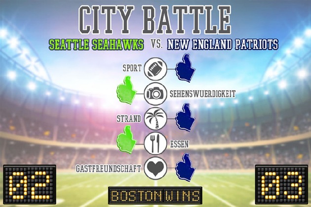 Am Sonntag ist Super Bowl 2015, das amerikanische Football-Fest der Superlative. Die Seattle Seahawks treten gegen die New England Patriots an - die Spannung steigt. Wer hat die freundlicheren Einwohner, wer die schöneren Sehenswürdigkeiten? Urlaubsguru.de hat Boston und Seattle in einem etwas anderen Battle antreten lassen. Zusätzlich gibt's zehn Funfacts für alle Superbowl-Fans. Die beste Vorbereitung für die große Nacht!