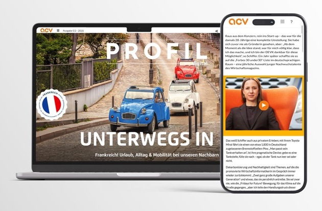 Der ACV stellt die interaktiven Online-Versionen seines Mitgliedermagazins kostenlos und mit zusätzlichen Inhalten auf seiner Website zur Verfügung: PROFIL digital - Magazin des ACV.