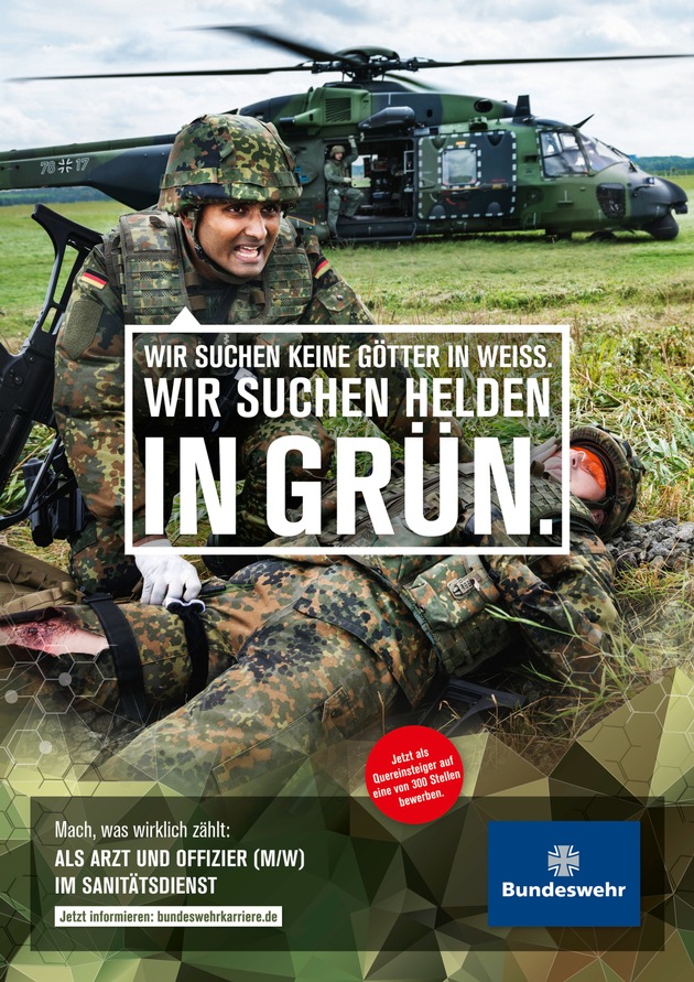 Mit provokanten Sprüchen wie "In der Pflege brauchst du Zeit. Keine Stoppuhr." und "Wir suchen keine Götter in Weiß. Wir suchen Helden in Grün." bricht die Bundeswehr in der Personalwerbung erneut mit Klischees. Die Fortsetzung der Arbeitgeberkampagne thematisiert das herausfordernde Spannungsfeld, in dem sich die Soldatinnen und Soldaten des Sanitätsdienstes der Bundeswehr befinden. Sie vereinen Soldaten- und Heilberuf in einer verantwortungsvollen Rolle.