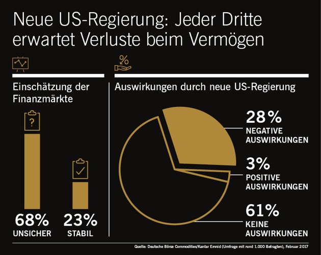 Der wirtschaftspolitische Kurs der neuen US-Regierung beschäftigt auch die Sparer in Deutschland: Knapp ein Drittel erwartet negative Auswirkungen auf das eigene Vermögen. Zu diesem Ergebnis kommt das aktuelle Anlage-Barometer der Deutsche Börse Commodities GmbH, das auf einer repräsentativen Emnid-Umfrage basiert. Insgesamt sorgen sich derzeit 58 Prozent der Deutschen um ihr eigenes Vermögen - ein Anstieg um fast zehn Prozentpunkte seit Oktober 2016. Geht es um die allgemeine Situation an den Finanzmärkten, schätzen zwei Drittel der Deutschen die Lage als unsicher ein. Damit bleibt die gefühlte Unsicherheit seit Oktober auf konstant hohem Niveau.