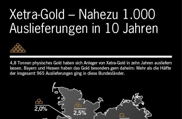Xetra-Gold-Anleger haben Anspruch auf die Auslieferung des verbrieften physischen Goldes. Seit der Einführung von Xetra-Gold im Jahr 2007 haben Anleger davon 965 Mal Gebrauch gemacht. Dabei wurden insgesamt 4,8 Tonnen Gold ausgeliefert. Bayern und Hessen haben das Gold besonders gern daheim: Mehr als die Hälfte der Auslieferungen ging in diese Bundesländer.
