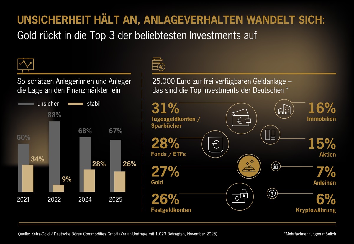 "Das Anlagebarometer zeigt, dass eine konstante Mehrheit der Deutschen die Lage an den Finanzmärkten als unsicher empfindet", sagt Steffen Orben, Geschäftsführer der Deutsche Börse Commodities GmbH. "Gleichzeitig deutet das repräsentative Stimmungsbild auf ein wachsendes Interesse an Gold hin, dessen Wert 2025 bislang um mehr als 50 Prozent gestiegen ist. Vor allem junge Menschen vertrauen immer stärker auf Gold, da es zu den stabilsten Anlageklassen zählt und sich der Kurs seit Jahren positiv entwickelt. Studien empfehlen einen Goldanteil von fünf bis zehn Prozent im Portfolio, um Vermögen abzusichern."