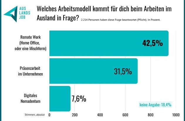 In der Umfrage wurde erhoben, welches Arbeitsmodell beim Arbeiten im Ausland bevorzugt wird. 42,5 % der Befragten - und damit die relative Mehrheit - gaben an, dass sie Remote Work oder eine Mischform aus Homeoffice und Präsenz favorisieren. 31,5 % bevorzugen hingegen die klassische Präsenzarbeit im Unternehmen, während 7,6 % das digitale Nomadentum als bevorzugtes Arbeitsmodell nannten. Insgesamt zeigt sich damit ein klarer Trend hin zu flexibleren Arbeitsmodellen: Die meisten Befragten legen Wert auf ortsunabhängiges oder hybrides Arbeiten - ein Hinweis darauf, dass Homeoffice-Möglichkeiten inzwischen nicht mehr nur ein Bonus, sondern für viele eine grundlegende Erwartung an moderne Arbeitgeber sind.