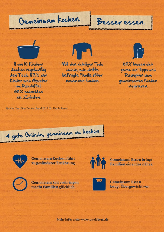 Ausgangspunkt aller Maßnahmen ist die große Vielfalt von Produkten unter dem Dach der Reismarke Uncle Ben's, die Eltern darin unterstützt, die ersten Schritte beim Kochen gemeinsam zu machen. Und da viele Reisgerichte auch mit Gemüse zubereitet werden, entstehen im Handumdrehen ausgewogene und schmackhafte Mahlzeiten für die ganze Familie. Dafür bietet Uncle Ben's eine Vielzahl an losem und Kochbeutel-Reis, schonend vorgegartem Express-Reis sowie Saucen an. Mehr Informationen unter www.unclebens.de.