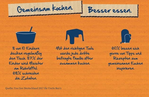 Im Rahmen der weltweiten Initiative "Ben's Beginners" stellt Uncle Ben's jetzt die Ergebnisse einer repräsentativen deutschen Online-Befragung zum Thema "Kochzeit ist Familienzeit" vor. Zusammen mit der bekannten Profiköchin Meta Hiltebrand möchte die Initiative das gemeinsame Kochen in der Familie wieder stärker fördern und zu mehr Spaß und Gelassenheit in der Küche aufrufen.