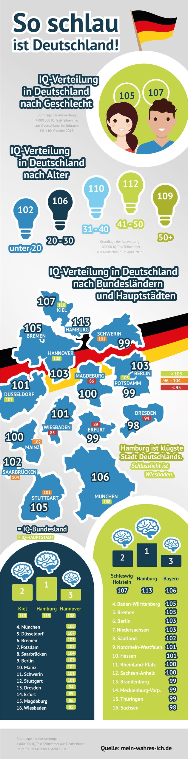 Dies ergibt die Auswertung des IQ Tests von Mein-wahres-ich.de, der im Zeitraum März bis Oktober 2015 von 4.000.000 Deutschen durchgeführt wurde. Untersucht wurde der durchschnittliche IQ der Teilnehmer aus den 100 größten Städten Deutschlands, der IQ in verschiedenen Altersgruppen und die Aufteilung nach Mann und Frau.