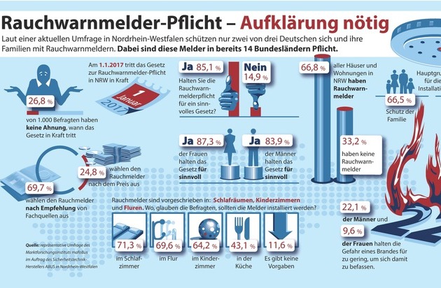 Rauchwarnmelder sind bereits in 14 von 16 Bundesländern in privat genutzten Wohngebäuden vorgeschrieben. Ab 1. Januar 2017 gilt die Warnmelder-Pflicht auch in Nordrhein-Westfalen. Allerdings wissen das viele nicht, wie eine repräsentative Umfrage des Marktforschungsinstituts mafo.de im Auftrag des Sicherheitstechnik-Herstellers ABUS in Nordrhein-Westfalen zeigt.