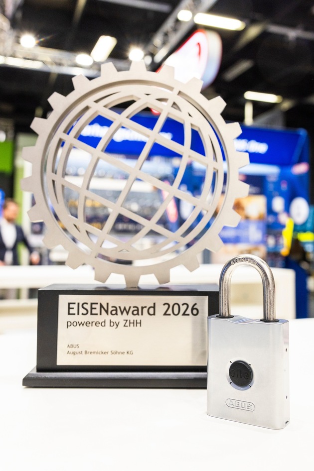 ABUS ist im Rahmen der Internationalen Eisenwarenmesse in Köln mit dem EISENaward 2026 ausgezeichnet worden. Prämiert wurde das smarte Vorhängeschloss „EVEROX One G3“, das mechanische Sicherheit mit digitaler Steuerung verbindet. Vergeben wird der Preis in Kooperation mit dem Zentralverband Hartwarenhandel e.V. (ZHH), dem Branchenverband des Hartwarenfachhandels mit Sitz in Düsseldorf - in diesem Jahr bereits zum achten Mal im Rahmen der Messe.