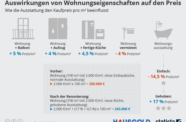 Hamburg, 30.08.2016 - In ein und derselben Straße werden zwei scheinbar sehr ähnliche Wohnungen verkauft, die eine für 200.000 Euro, die andere für gut 240.000 Euro. Warum unterscheiden sich die Verkaufspreise so immens? Die Immobilienberatung HAUSGOLD hat analysiert, welche Wohnungseigenschaften in welchem Umfang den Verkaufspreis einer Immobilie beeinflussen und wann sich Renovierungen lohnen.