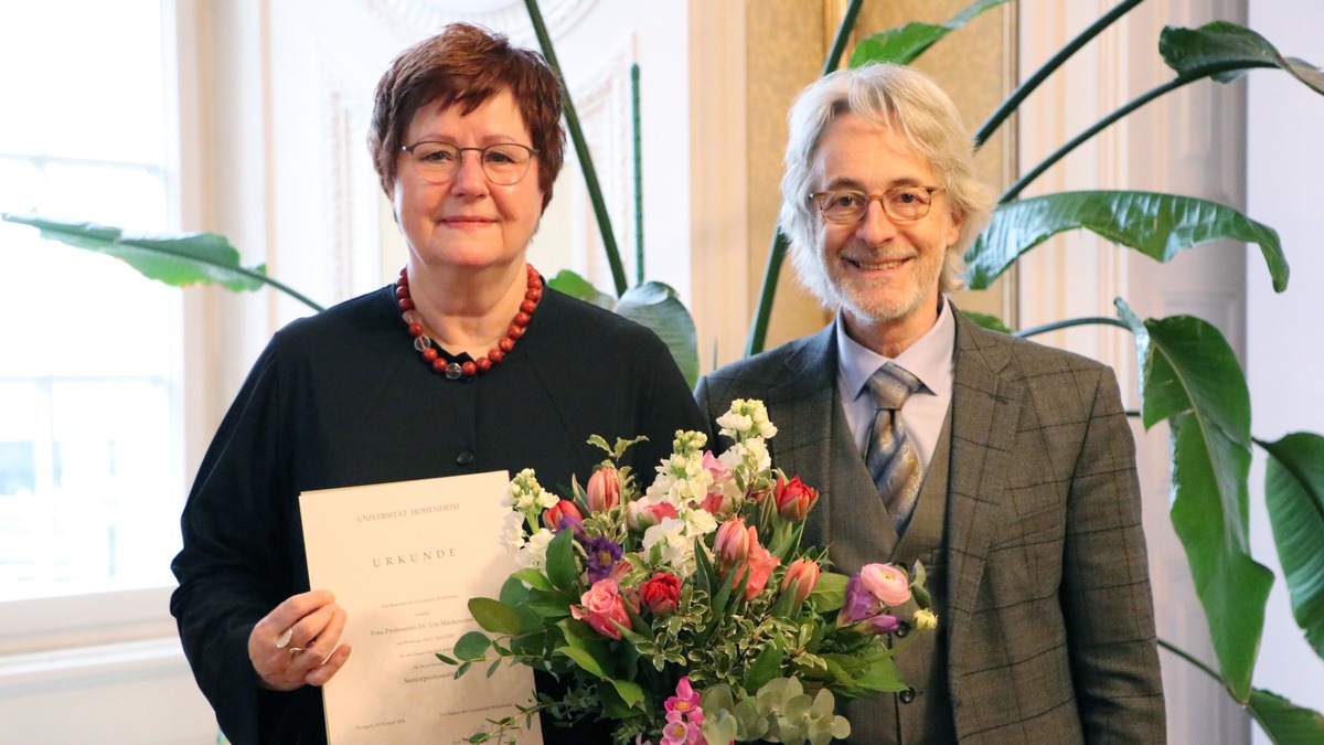 „Ihr großes Engagement, ihre internationale Vernetzung und ihr wissenschaftliches Renommee haben wesentlich zur Sichtbarkeit der Universität Hohenheim beigetragen“, betonte der Rektor und bedankte sich für die fast 30 Jahre, in denen die ehemalige Vize-Rektorin und Prorektorin für Lehre sowie langjährige Gleichstellungsbeauftragte das Geschehen und die Entwicklung der Universität aktiv mitbestimmte.