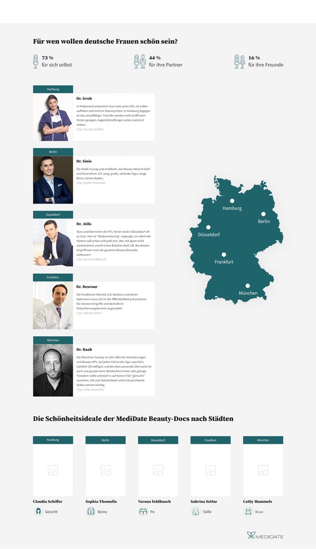 Nora Tschirners Kampagne "Body Embracement" rund um den Film "Embrace" und die große Resonanz beweisen aber auch: Beautyideale aus Traumfabriken wie Hollywood sind oft aufgezwungen und nicht passend für "normale" Frauen. Das heißt aber nicht, dass Frauen nicht gerne schön sein wollen. Ganz im Gegenteil: Beautyideale und prominente Vorbilder sind und waren immer da: von Claudia Schiffer bis Iris Berben hat Deutschland genug selbstbewusste und schöne Frauen in allen Regionen. Viele Frauen eifern diesen nach, bestätigen die Fachärzte von MediDate, Europas führende Plattform für erstklassige Behandlungen im Bereich der Lifestylechirurgie. MediDate Fachärzte behandeln dabei jedoch nicht nur Prominente und Society-Mitglieder, sondern sind auch für Bürgerinnen aus Hamburg, Berlin, Frankfurt, Düsseldorf, Köln und München erschwinglich: jede Region von Nord bis Süd, so stellen sie fest, hat eigene Beauty-Vorlieben und Trends.
