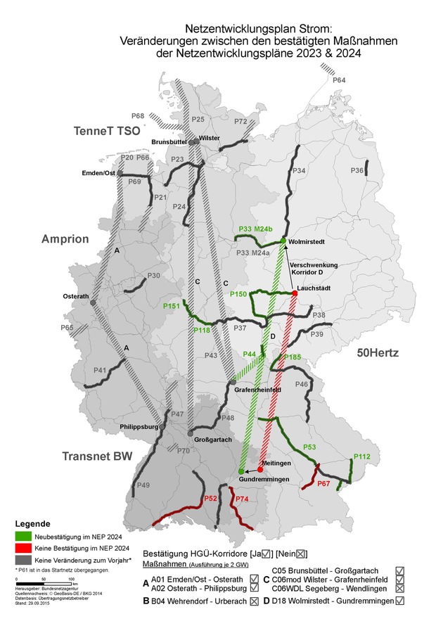 Der NEP beinhaltet noch keine konkreten Trassenverläufe, sondern definiert nur die Anfangs- und Endpunkte von zukünftigen Leitungsverbindungen. Bei einer der großen Gleichstromverbindungen, dem sogenannten "Korridor D" (Maßnahme D18), wurden im NEP 2024 neue Punkte definiert. Statt von Lauchstädt nach Meitingen soll die Leitung nun von Wolmirstedt nach Gundremmingen geführt werden. Die BNetzA vermerkt hier zusätzlich, dass aus netztechnischer Sicht auch der Endpunkt Isar/Landshut denkbar wäre. Die Entscheidung liegt nun beim Bundestag.