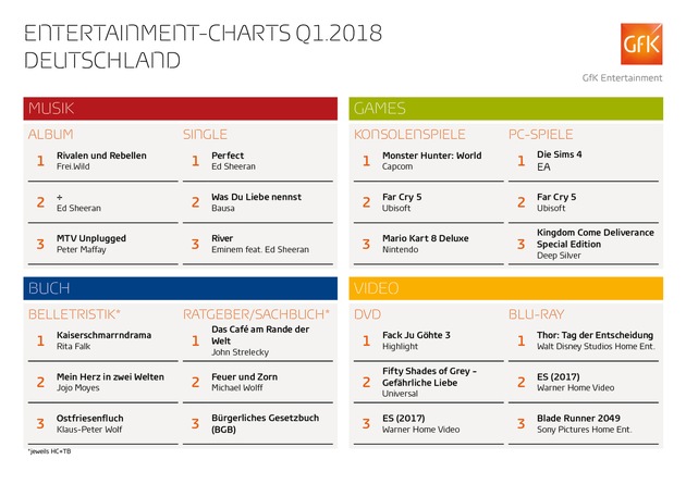 Welche Songs, Bücher, Spiele und Filme haben die Deutschen in den ersten drei Monaten des Jahres am meisten unterhalten? Aufschluss darüber gibt eine Sonderauswertung von GfK Entertainment. Der offizielle Chartermittler hat die Topseller des ersten Quartals 2018 aus vier verschiedenen Entertainment-Bereichen zusammenfasst.