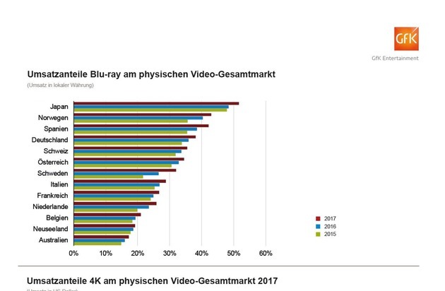 In Deutschland wurden 2017 rund 38 Prozent der physischen Video-Erlöse mit Blu-rays erzielt. 2015 waren es noch 34 Prozent. Auch in Österreich und der Schweiz verbesserten sich die Blu-ray-Marktanteile um jeweils drei Prozentpunkte auf 34 bzw. 35 Prozent. Die größte Begeisterung kommt in Japan auf, wo mittlerweile mehr als jeder zweite Yen (52 Prozent) mit Blu-rays erwirtschaftet wird.