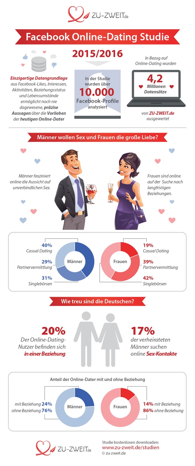 Online-Dating in Deutschland boomt. Über 10 Millionen Menschen suchen in Deutschland aktuell im Internet nach einem Flirt, dem Partner für´s Leben oder nach aufregendem Sex. Das Online-Dating-Vergleichsportal ZU-ZWEIT.de analysierte in einer aktuellen Studie mit der LMU München Facebook-Likes, Interessen, Aktivitäten, Beziehungsstatus und Lebensumstände von 10.000 Facebook-Profilen mit 4,2 Millionen Datensätzen in Bezug auf Online-Dating. Was liken Singles auf der Suche nach einer festen Partnerschaft oder Sexkontakten?