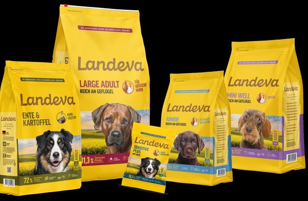 Die Marke Landeva umfasst Hundenahrung im Mittel- bis Premiumsegment und richtet sich an gut informierte Hundebesitzer mit einem hohen Qualitätsanspruch. Landeva startet mit 35 Einzelartikeln. Das Sortiment umfasst Junior-, Mini- und Adult-Produkte, verschiedene Proteinquellen und Verpackungsgrößen.