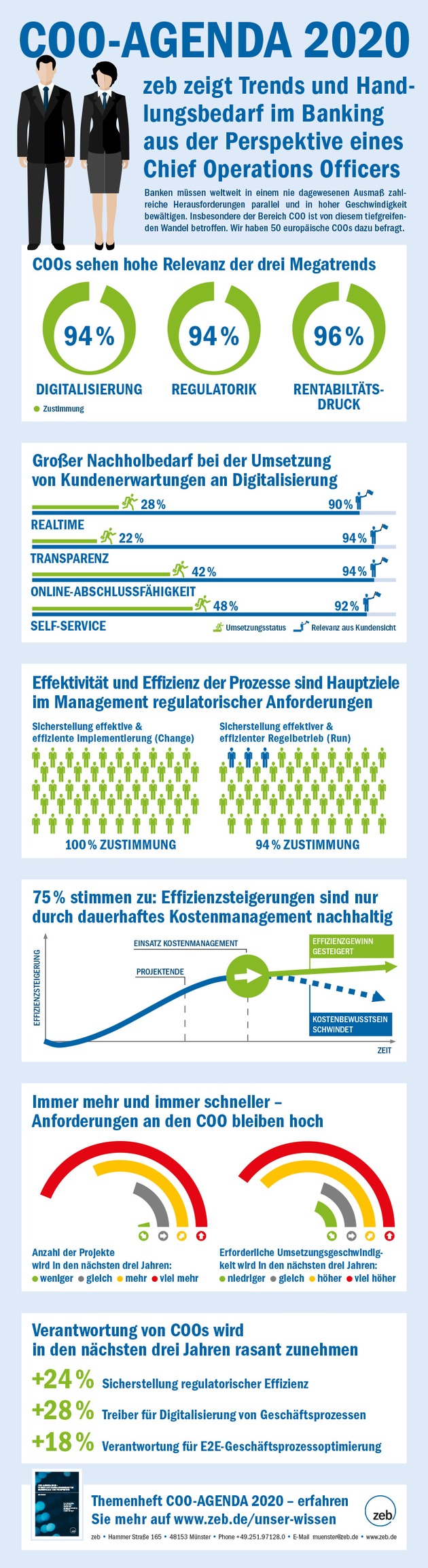 Verstärkt wird der Druck auf den COO-Bereich durch ein Phänomen, das nicht nur die Bankenlandschaft betrifft. Über 90 % der befragten COOs gaben an, dass die Anzahl der Initiativen bzw. Projekte für die sie Verantwortung tragen, in den letzten drei Jahren gestiegen ist. 60 % der Befragten spürten sogar einen deutlichen Anstieg. Mehr als drei Viertel sind der Auffassung, dass die Anzahl in den kommenden drei Jahren sogar noch weiter steigen wird. Hinzu kommt die zunehmende Geschwindigkeit, mit der Initiativen umgesetzt werden müssen. Während etwa drei viertel der Studienteilnehmer angaben, dass die erforderliche Umsetzungsgeschwindigkeit in den letzten drei Jahren gestiegen ist, erwarten nahezu 80 % eine nochmalige Beschleunigung in der Zukunft. "Die Situation - 'immer mehr und immer schneller' - stellt den COO-Bereich, wie auch die übrigen CxO-Bereiche vor enorme Herausforderungen", so Michael Herkert, Partner bei zeb und Autor der Studie. "Zu bewältigen ist sie nur gemeinsam, d. h. ressort- bzw. siloübergreifend. Dem COO-Bereich kommt dabei als Gestalter des Operating Model eine zentrale Rolle bei Koordination und Umsetzung zu."