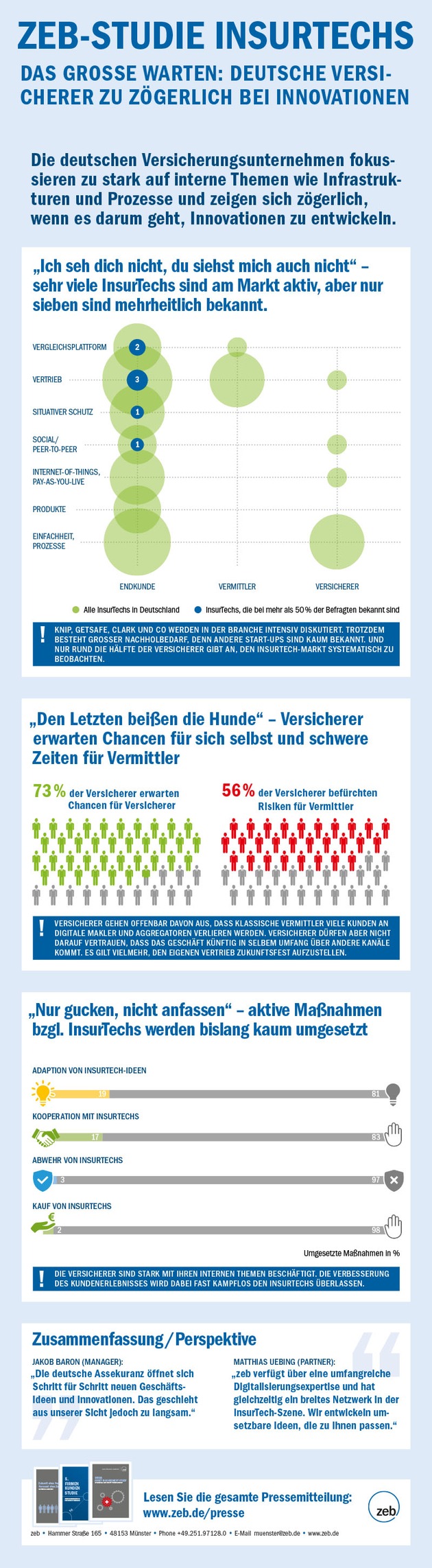 Dies sind zentrale Ergebnisse der aktuellen InsurTech-Studie von zeb. Die Strategie- und Managementberatung - führend in der Beratung von Unternehmen im europäischen Finanzsektor - hat untersucht, wie deutsche Versicherungsunternehmen aktuelle InsurTech-Trends bewerten und beabsichtigen, darauf zu reagieren. Insgesamt haben sich über 120 Vorstände, Führungskräfte und Experten aus der Versicherungsbranche an der zeb-Studie beteiligt, was gemessen am Beitragsvolumen mehr als 80 % des deutschen Versicherungsmarktes entspricht.