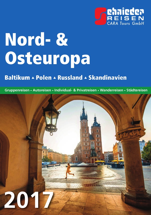 Auf 132 Seiten präsentiert der Hamburger Reiseveranstalter Schnieder Reisen sein umfangreiches Reiseprogramm für die baltischen Staaten Estland, Lettland und Litauen sowie für Polen, Russland. Geführte und individuelle Auto-, Städte- und Wanderreisen werden 2017 angeboten. Neu im Programm: "Masuren -Wandern und genießen" (8-tägige Wanderreise), eine 12-tägige geführte Erlebisreise "Entdeckungen entlang der Memel", eine Südpolen Autorundreise "Königsschlösser, Kirchen und Bürgerhäuser" und die geführte Privatreise "Moskau und der Goldene Ring". Schnieder Reisen wird außerdem 3 weitere Kataloge herausbringen: Motorradreisen, Radreisen und einen Irland & Großbritannien Katalog. Kataloganforderung: www.schnieder-reisen.de Schnieder Reisen-CARA Tours GmbH Hellbrookkamp 29 D- 22177 Hamburg Tel. (0049) 040/3802060