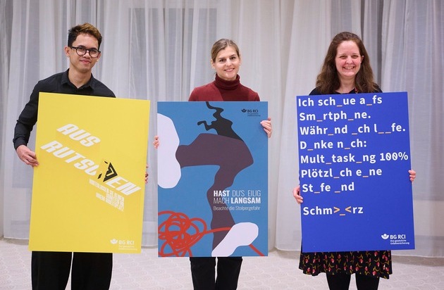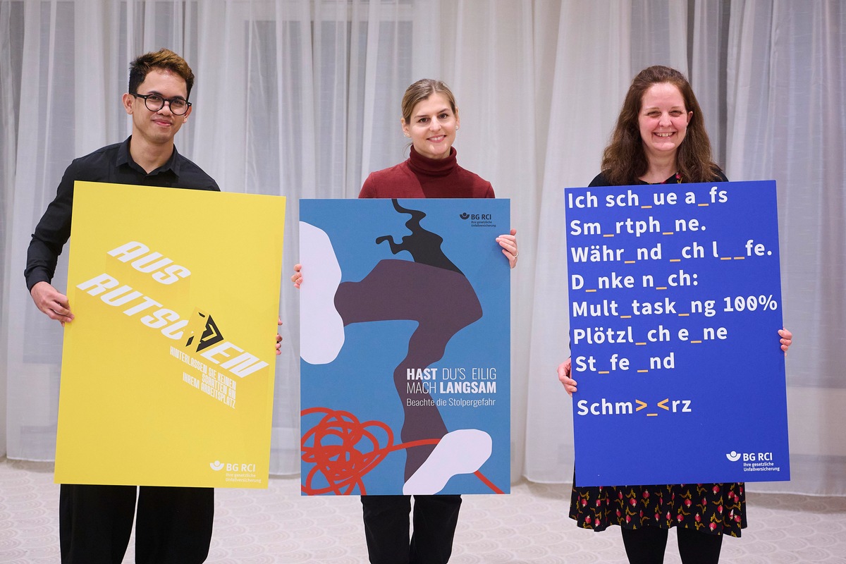 Die Siegerinnen und Sieger des dritten Arbeitsschutzplakatwettbewerbs der Berufsgenossenschaft Rohstoffe und chemische Industrie (BG RCI) stehen fest: Aleksandra Borzunova (Hochschule Rhein-Waal), Channa Chheng (University of Europe for Applied Sciences Berlin) und Nina Maria Drangmeister (Hochschule Trier) wurden für ihre Plakatserien zum Thema Stolpern, Rutschen, Stürzen (SRS) ausgezeichnet. Der Wettbewerb ist mit insgesamt 6.000 Euro dotiert.
