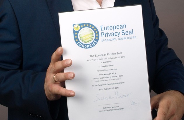 Bereits zum zweiten Mal nach 2012 wurde der Bremer Consultix GmbH das Europäische Datenschutz-Gütesiegel European Privacy Seal (EuroPriSe) verliehen. Mit dem Gütesiegel wurde erneut die Marketing-Plattform ProCampaign® zertifiziert. ProCampaign ist eine Customer-Engagement-Lösung, die für namhafte Konzerne weltweit 100 Millionen Kundenprofile in über 50 Ländern verwaltet und managt. Die EuroPriSe-Zertifizierungsstelle lobte besonders die transparente Kommunikation rund um Fragen des Datenschutzes sowie das durchdachte Datenschutzkonzept der Bremer Datenspezialisten. Nutzer von ProCampaign könnten sicher sein, dass sie bei der Verarbeitung von Konsumentendaten die geltenden Anforderungen der EU-Datenschutz-Grundverordnung (EU-DSGVO) einhalten. ProCampaign ist derzeit die einzige Customer-Engagement-/CRM-Lösung, die mit dem Europäischen Datenschutz-Gütesiegel ausgezeichnet ist.