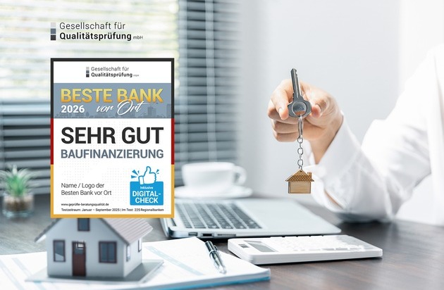Mit dem Prädikat "SEHR GUT in der Baufinanzierung 2026" zeichnet die Gesellschaft für Qualitätsprüfung auch in diesem Jahr Höchstleistung in Kundenorientierung und Fachkompetenz in der Bankberatung zum Thema Baufinanzierung aus. Die Ergebnisse liefern Verbrauchern eine wertvolle Orientierungshilfe im schwer überschaubaren Angebotsdschungel.
