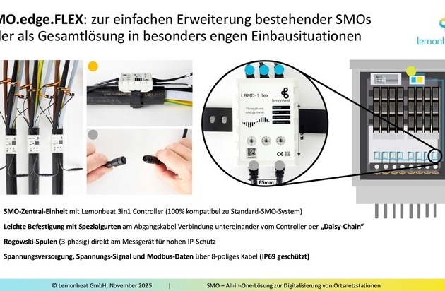 Mit der modularen Plattform „Smarte Ortsnetzstationen“ (SMO) von Lemonbeat können Verteilnetzbetreiber ihre ONS in kurzer Zeit und ohne großen Aufwand digital nachrüsten. Die neue Variante SMO.edge.FLEX, die für enge Einbausituationen entwickelt wurde, kann als Erweiterung bestehender SMO.edge-Systeme oder als Gesamtlösung eingesetzt werden. Wichtigste Neuerung: bei SMO.edge.flex sind die Energiemessgeräte nicht in einem gemeinsamen Gehäuse mit Gateway und USV integriert, sondern separat via Kabel angeschlossen und können so variabel an die einzelnen Abgänge montiert werden.