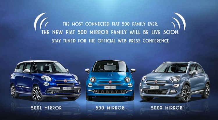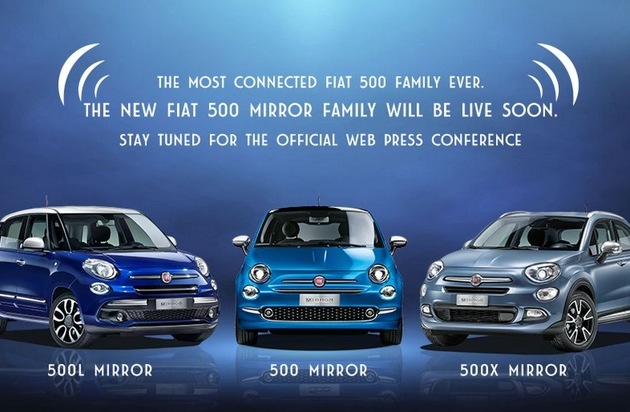 Am heutigen Freitag um 11:30 Uhr findet online unter https://500mirrorfamily.fcagroup.com/ die Web-Pressekonferenz zu den Sondermodellen Fiat 500 Mirror, Fiat 500L Mirror und Fiat 500X Mirror statt.
