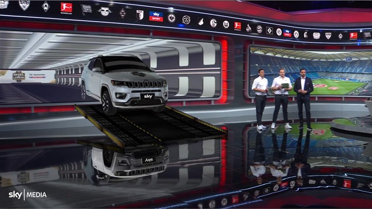 Sky Media und Sky Sport inszenieren den Jeep® Compass in Augmented Reality. Im Sky Bundesliga-Studio fuhr das kompakte SUV von Jeep am vergangenen Samstag per AR-Animation aus der Leinwand in das Studio. Dabei bediente Sky sich der State-of-the-art-Technik der Firmen VizRT und NCAM, um die Augmented-Reality-Grafiken in Verbindung mit der LED-Leinwand im neuen Sky Sport HQ umzusetzen.