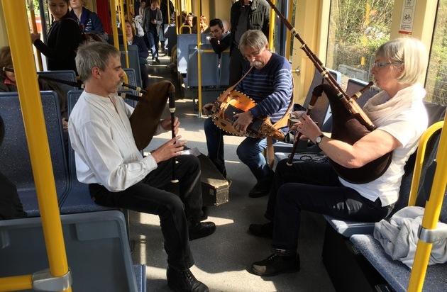 Es war vermutlich der ungewöhnlichste Auftritt in der KVB-Reihe "Musik in der Bahn": Lissa Nierhoff, Christoph Commes und Ruprecht Niepold vom Ensemble "Cornemuse Consort Coelln" unterhielten am Samstagnachmittag mit Dudelsack und Drehleier die Fahrgäste auf der Stadtbahn-Llinie 7 in Porz und in Poll. Bislang hatten vor allem Blasmusik, Chorgesang oder kölsche Töne die Kurzkonzerte in den Stadtbahnen geprägt - die Darbietungen der drei Musiker eröffneten eine ganz neue musikalische Perspektive. Und so kamen die Akteure auch mit interessierten Fahrgästen ins Gespräch: über ihre Instrumente, ihre Musik etc. "Starke Aktion", meinte ein junger Mann im Anschluss.