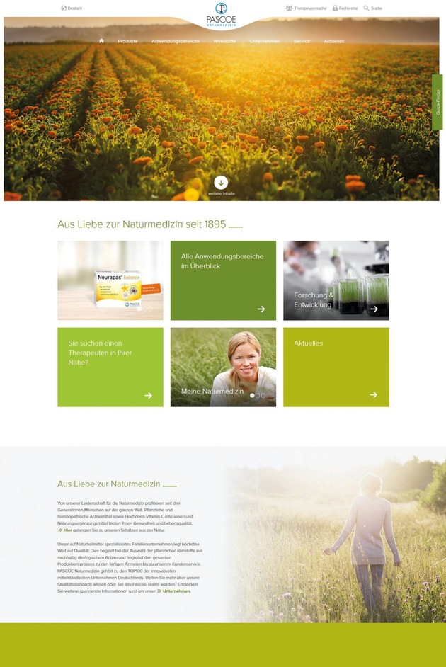 Schon auf der Startseite ist die Liebe zu Mensch und Natur deutlich spürbar. Hier eröffnet sich dem Besucher durch eingebettete Filmsequenzen der Blick auf die heimischen Heilpflanzenfelder und nimmt ihn mit auf eine emotionale Reise in die Welt der Naturmedizin. Eine bessere Bedienbarkeit und eine schnellere Orientierung im breiten Produktangebot von PASCOE Naturmedizin waren die Vorgaben an die Entwickler. Die Bereiche "Produkte" und "Anwendungsgebiete" erhielten daher einen verbesserten Aufbau und eine vereinfachte Suchfunktion. Im Bereich "Wirkstoffe" wird jede Arzneipflanze einzeln abgebildet und erklärt.