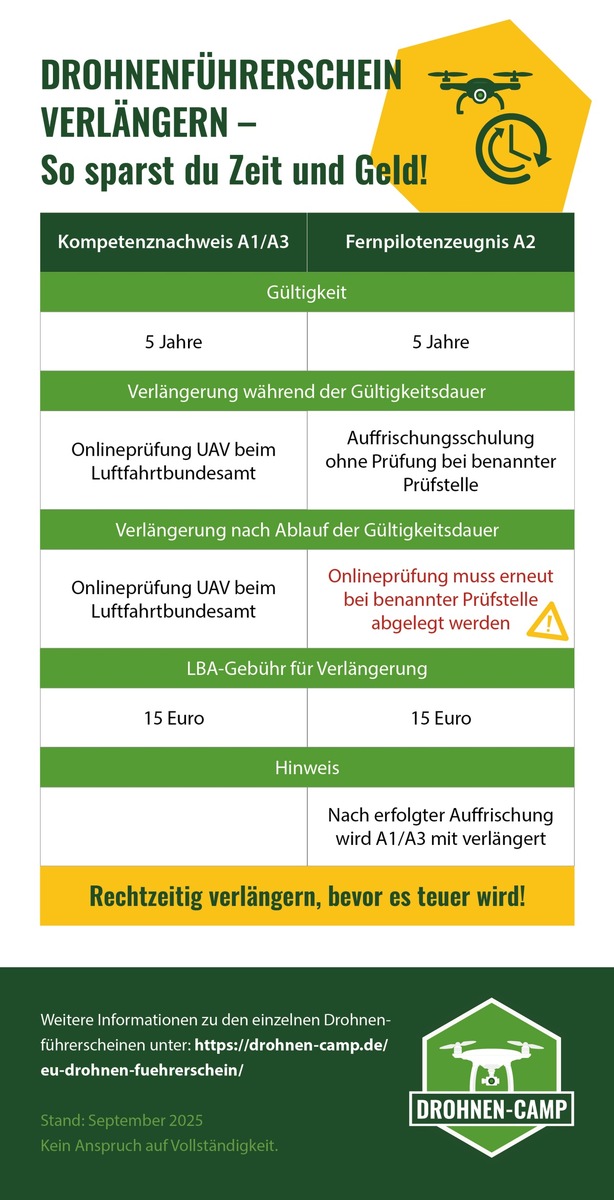 Wer sich frühzeitig um seine Verlängerung kümmert, spart nicht nur bares Geld, sondern vermeidet auch unnötigen Prüfungsstress. Die Infografik von Drohnen-Camp.de bietet dafür einen schnellen Überblick.