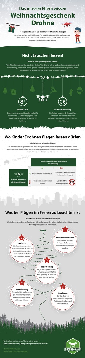 „Viele Eltern schenken eine vermeintliche Kinder-Drohne und erfahren erst später, dass ihr Kind sie gar nicht allein fliegen darf. Der Begriff ‚Kinder-Drohne‘ ist gesetzlich nicht definiert“, erklärt Francis Markert, Drohnenausbilder und Mitgründer von Drohnen-Camp.de. „Viele Geräte sehen aus wie Spielzeug, sind aber rechtlich vollwertige Drohnen. Jedes Jahr führt das zu enttäuschten Kindern und verunsicherten Eltern.“