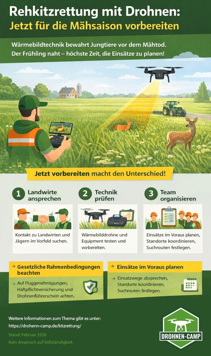 Drohnen-Camp stellt unter https://drohnen-camp.de/kitzrettung/ eine umfassende Informationsseite zur Rehkitzrettung bereit. Sie bündelt die wichtigsten Schritte für den Einstieg, organisatorische Abläufe sowie rechtliche Voraussetzungen für Drohnenpiloten. Ziel ist es, Vereinen und engagierten Helfern eine strukturierte Orientierung für Antragstellung und Einsatzplanung zu geben.