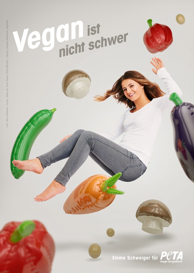 Emma Schweiger fliegt auf buntes Gemüse: Auf dem neuen Motiv der Tierrechtsorganisation PETA schwebt die Schauspielerin lachend inmitten von luftigen Zucchini, Paprika und Champignons - denn: "Vegan ist nicht schwer", so der Claim der neuen Kampagne. Gemeinsam mit PETA zeigt die 15-Jährige pünktlich zum Frühlingsbeginn, dass eine tierfreundliche und vegane Lebensweise Spaß macht und einfach umzusetzen ist. Im Making-of-Video des Shootings appelliert Emma Schweiger an alle Verbraucher, das tierfreundliche Leben einmal auszuprobieren. So kann jeder erleben, wie leicht die Umstellung ist.