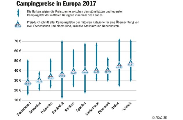 Zwei Erwachsene mit einem zehnjährigen Kind zahlen in der Sommer-Hauptsaison 2017 durchschnittlich 35,70 Euro für eine Übernachtung auf einem europäischen Campingplatz der mittleren Kategorie. Das sind etwa zwei Prozent mehr als 2016, wie aus einem Preisvergleich des ADAC Campingführers 2017 der ADAC Verlag GmbH & Co. KG hervorgeht. Im Vergleichspreis enthalten sind der Auto- und der Caravan-Standplatz sowie die wichtigsten Nebenkosten wie Strom, Warmduschen und die Kurtaxe.