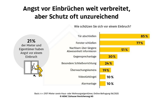 Für die Umfrage hat das Institut Norstat im Auftrag der ADAC Zuhause Versicherung im Juni 2025 insgesamt 2.107 Personen ab 18 Jahren online befragt, die in einem eigenen Haushalt oder einer Wohngemeinschaft leben.