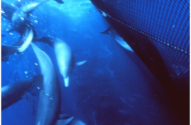 Foto: Delfine gefangen im Ringwadennetz beim Thunfischfang im tropischen Ostpazifik von Sam La Budde.