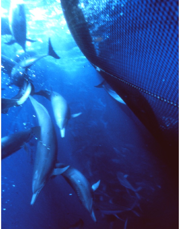 Foto: Delfine gefangen im Ringwadennetz beim Thunfischfang im tropischen Ostpazifik von Sam La Budde.